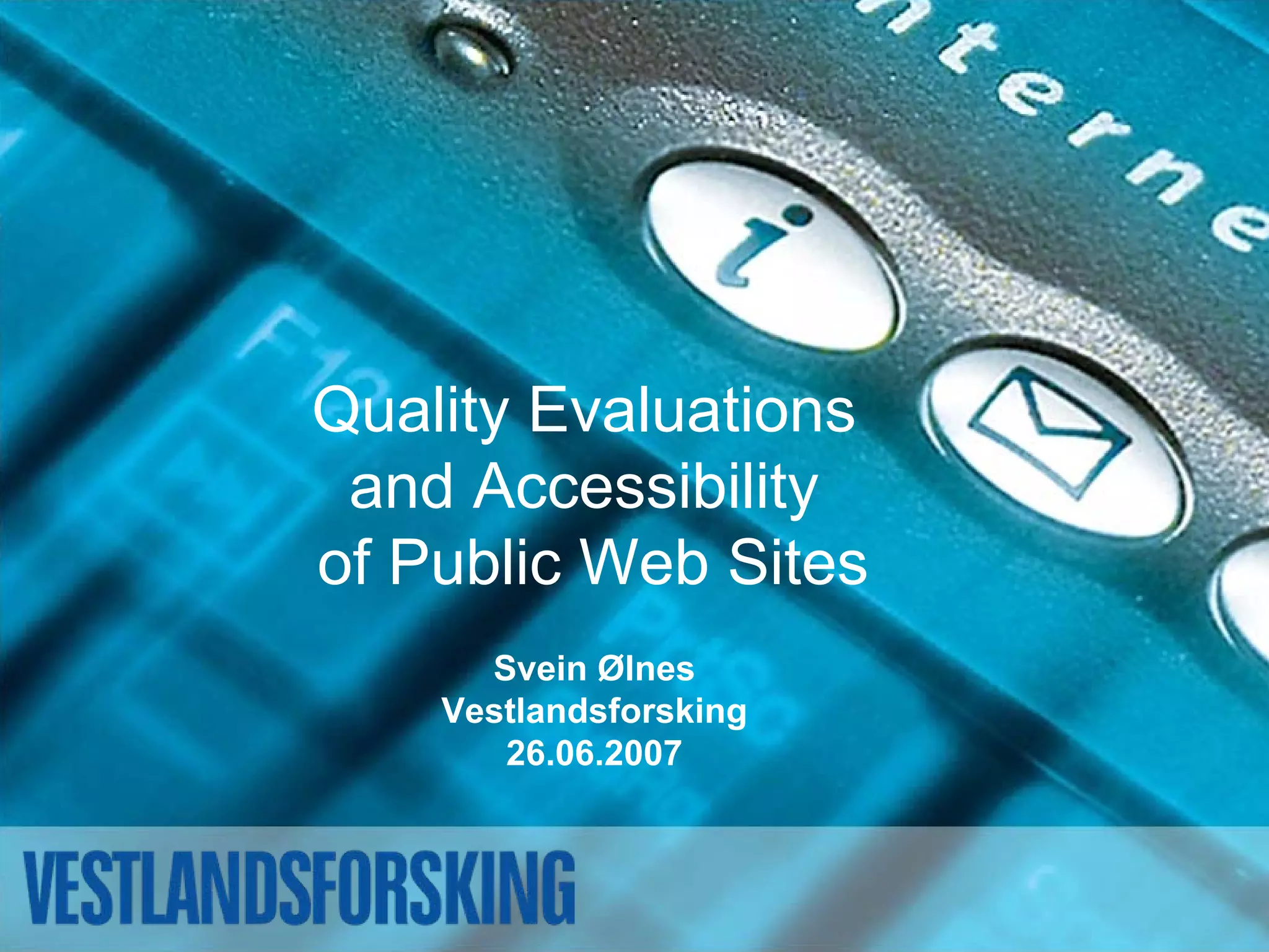 The document discusses quality evaluations and accessibility of public websites in Norway, initiated in 2001 and managed by norge.no since 2004, with 691 websites evaluated in 2006. The evaluation methodology involves expert assessments focusing on three areas: accessibility, user orientation, and usable services, with detailed indicators based on established guidelines. Results indicated improvements across the evaluated sites, highlighting challenges in transforming guidelines into actionable indicators and the need for both expert and automated testing in future assessments.