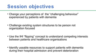 The document discusses supporting people with dementia in hospital settings. It aims to change perceptions of behaviors in dementia patients, challenge existing hospital systems to be more patient-focused, and identify resources to help dementia patients during hospital admissions. Specific challenges in caring for dementia patients in hospitals are outlined, including how the environment can increase confusion and distress. The language used to describe dementia and behaviors is also addressed.