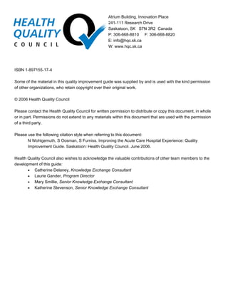 The document provides guidance for healthcare organizations to improve the patient experience through quality improvement projects. It outlines a three-phase process: planning, executing, and reflecting. The planning phase involves creating a "blueprint for success" which identifies the priority area, leadership team, aims, deliverables, scope, sponsor, and expectations. It emphasizes establishing effective multidisciplinary teams that include patients. The executing phase provides strategies, tools, and tips for implementing ideas. The reflecting phase involves analyzing current processes and identifying opportunities for change. The document aims to guide organizations through each step to achieve successful quality improvement.