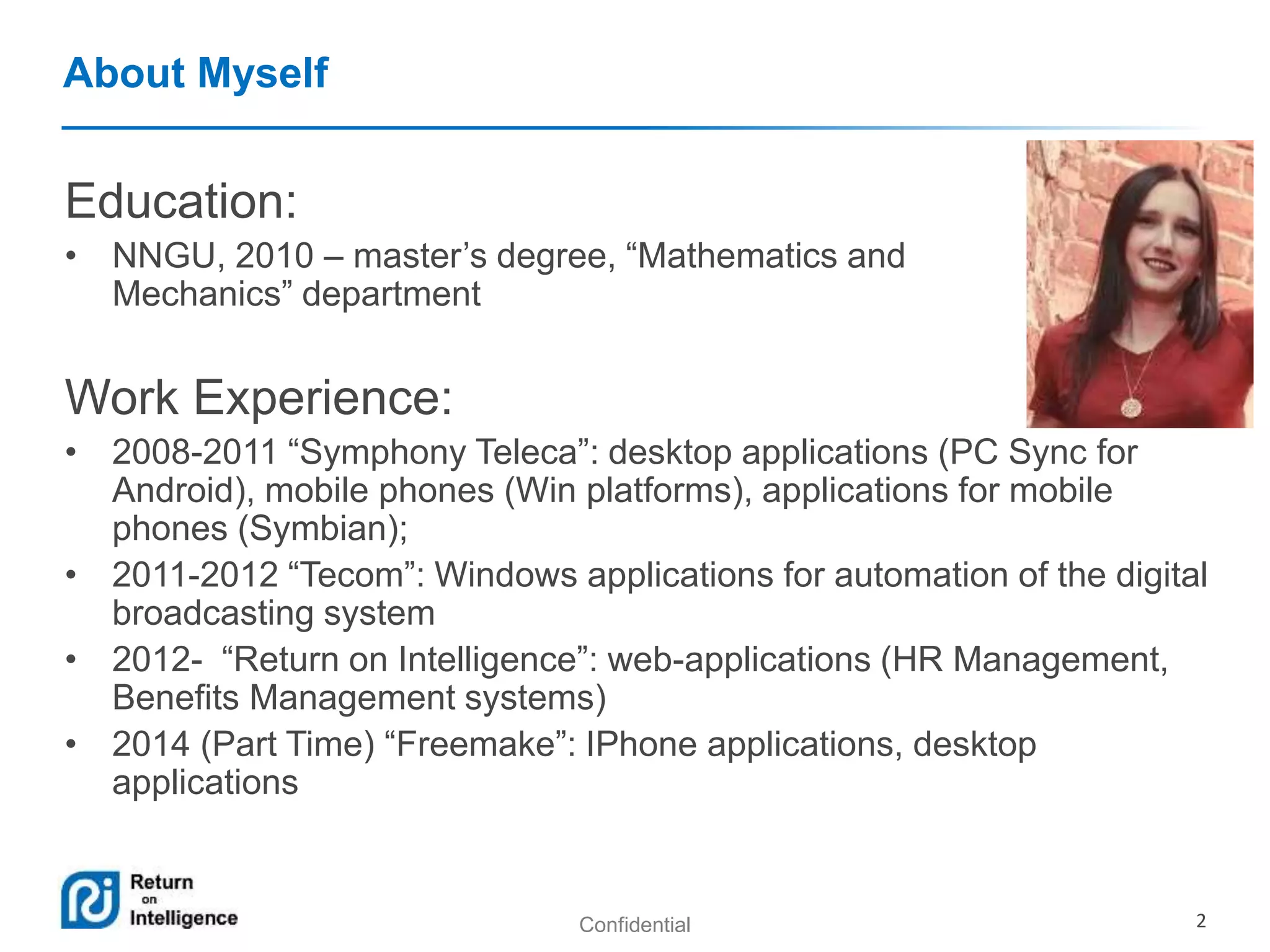 This document provides an overview of quality in software development according to ISO standards. It begins with Maria Teryokhina introducing her education and work experience in software development. The goal is then stated as observing general quality points and processes according to ISO standards. Various definitions and perspectives on quality from philosophy, economy, and standards are presented. Key aspects of quality like functionality, reliability, and maintainability are defined according to ISO 9126. Process quality frameworks like CMM, CMMI, and ISO 9000 are overviewed. Quality control and quality assurance are distinguished as reactive and proactive approaches. Principles of quality management are discussed throughout.
