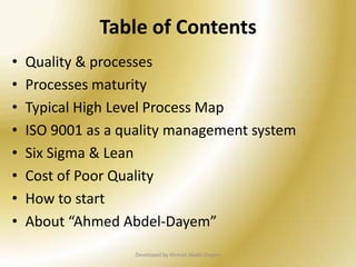 This document discusses quality processes in telecom operators. It covers topics such as quality management systems, process maturity, typical processes like planning and operations, ISO 9001, Six Sigma, Lean, and cost of poor quality. It provides a high level process map and explains that quality results from quality processes. Processes should be managed by empowered teams and form the quality management system. The document also provides guidance on getting started with quality initiatives and introduces Ahmed Abdel-Dayem.