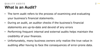 The document discusses the importance and types of audits in business quality management, including internal, external, and government audits. It explains the processes involved in each audit type, emphasizing the need for preparation and collaboration between management and auditors. Additionally, it highlights the benefits of quality auditing and management, such as improved customer satisfaction, enhanced compliance, and fostering continuous improvement.