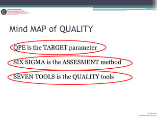 The document discusses seven basic quality tools: check sheets, stratification, histograms, Pareto charts, Ishikawa diagrams, scatter diagrams, and control charts. It provides examples and explanations of how to implement each tool, including how to classify data, indicate locations and frequencies, and analyze relationships between variables. Check sheets involve tallying traits, stratification organizes data into classifications, histograms and Pareto charts display distributions graphically, and scatter diagrams and control charts assess correlations. Ishikawa diagrams map potential causes for effects through a cause-and-effect tree structure.