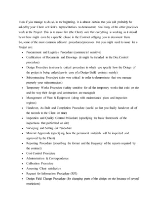 This document discusses quality management procedures for construction projects. It begins by outlining six basic procedures required by the ISO 9001 standard, but notes these are not sufficient on their own for large construction projects. Additional common procedures are then listed across areas like procurement, design, subcontracting, and handover. Quality management tools like check sheets, control charts, Pareto charts, and scatter plots are also defined. The document emphasizes keeping quality systems simple in order to ensure usability and compliance.