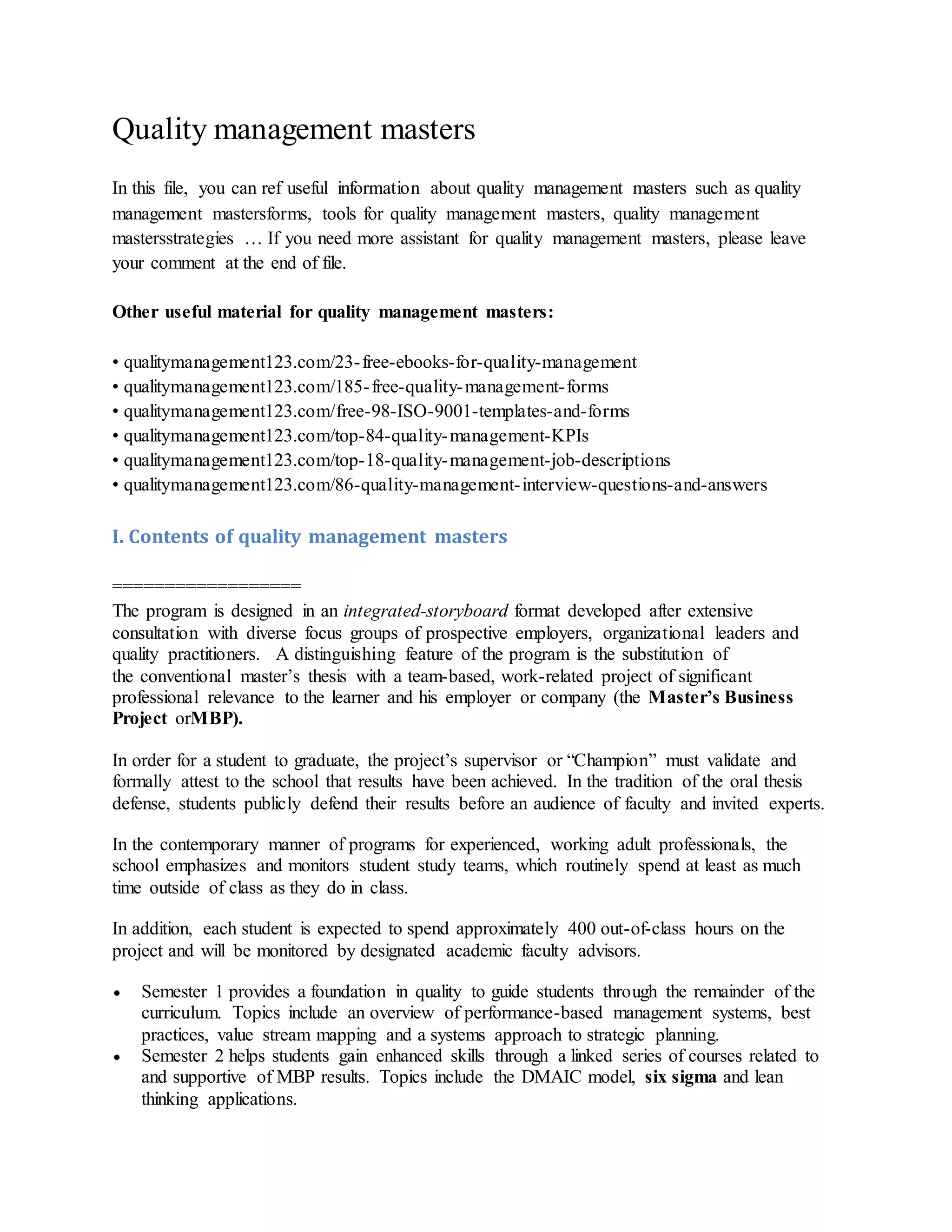This document provides an overview of the contents and tools of a Quality Management Masters program. The summary is: