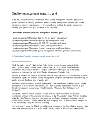 This document discusses quality management maturity grids and provides resources on quality management. It introduces Philip Crosby's Quality Management Maturity Grid, which is a 5x6 matrix that assesses an organization's quality management maturity across six categories. It can identify an organization's current stage of maturity and provide a roadmap for quality improvement. The document also lists several quality management tools, such as check sheets, control charts, Pareto charts, scatter plots, Ishikawa diagrams, and histograms. Additional related topics on quality management are provided.