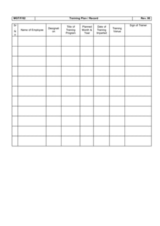 This document contains various quality management forms used by an organization including forms related to employees, training, non-conformances, inquiries and orders, quotations, customer feedback, purchase orders, suppliers, manufacturing, inspection, calibration, and instruments. The forms provide templates for collecting information on topics such as employee details, training plans, non-conformity reports, purchase orders, supplier registration, inspection reports, calibration plans, and lists of machines and instruments.