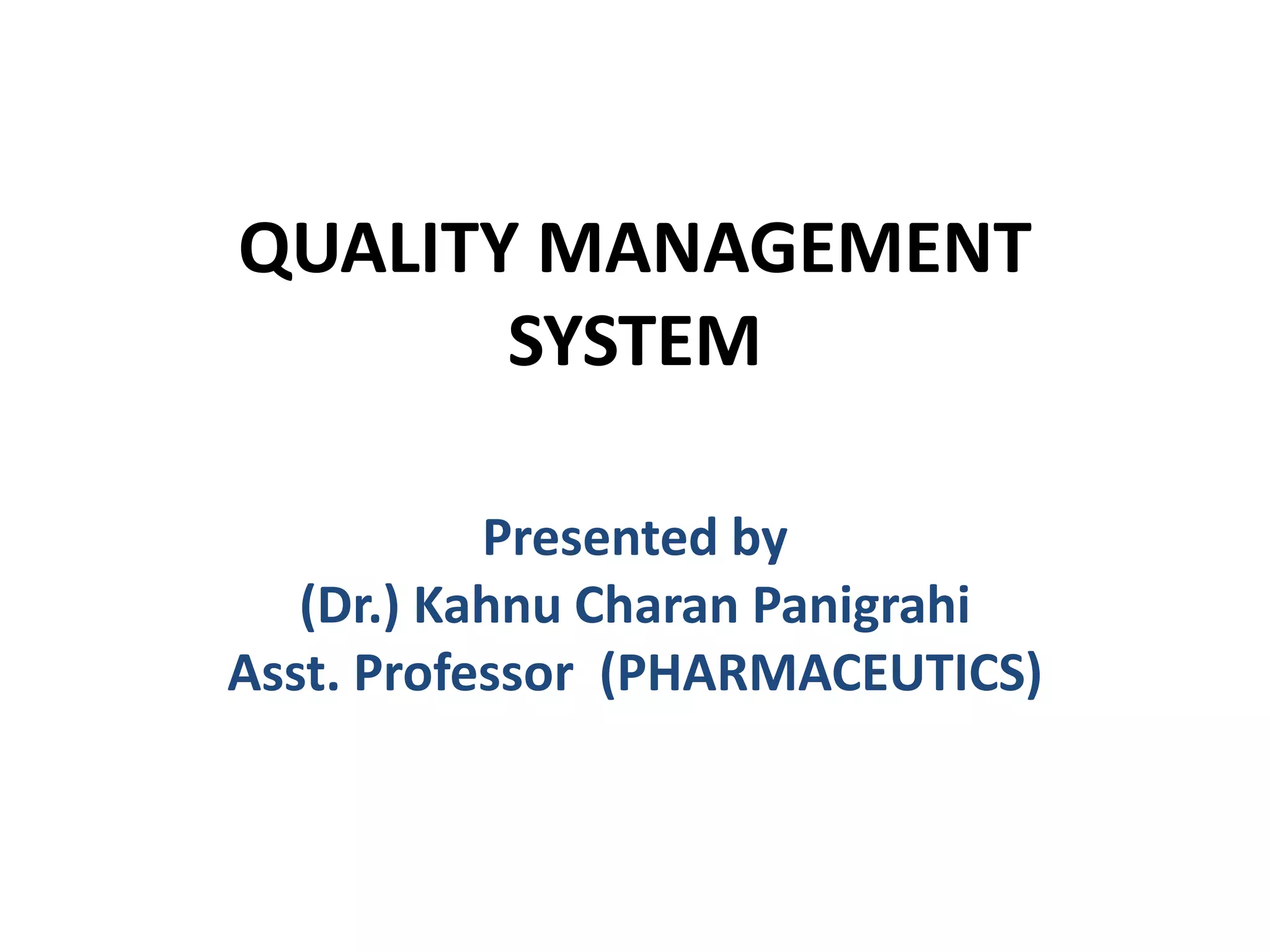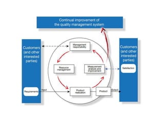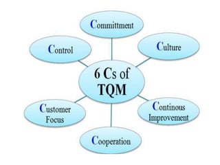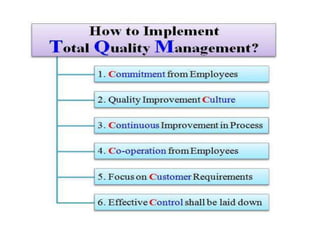 Total quality management (TQM) is a management approach focused on customer satisfaction through continual improvement. It involves all employees and emphasizes strategic planning, fact-based decision making, and effective communication. TQM aims to hold all parties accountable for quality and can improve profitability, customer satisfaction, productivity, and employee morale. Quality by design (QbD) is a concept where quality is planned and designed into products and processes from the development stage to reduce issues and meet customer needs.