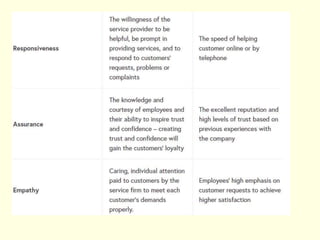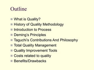 This document provides an introduction to quality concepts. It defines quality in several ways from various quality experts and discusses key dimensions of quality for both products and services. The history of quality methodology is reviewed, covering contributions from quality gurus like Deming, Taguchi, and the concepts of total quality management. Common quality tools are introduced, including flowcharts, check sheets, scatter diagrams, histograms, Pareto charts, cause-and-effect diagrams, and control charts. The document also discusses costs related to quality and benefits/drawbacks of quality initiatives.