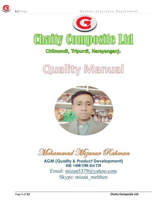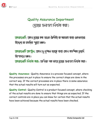 This document outlines responsibilities and procedures for the Quality Assurance Department of Chaity Composite Ltd. It defines key quality roles such as the AGM of Quality and Product Development who is responsible for planning, monitoring quality standards, and responding to customer complaints. It also describes the responsibilities of assistant managers for H&M quality and general quality assurance duties. Finally, it provides standard operating procedures for fabric inspection, delivery approval, and defining defects using a four point system.