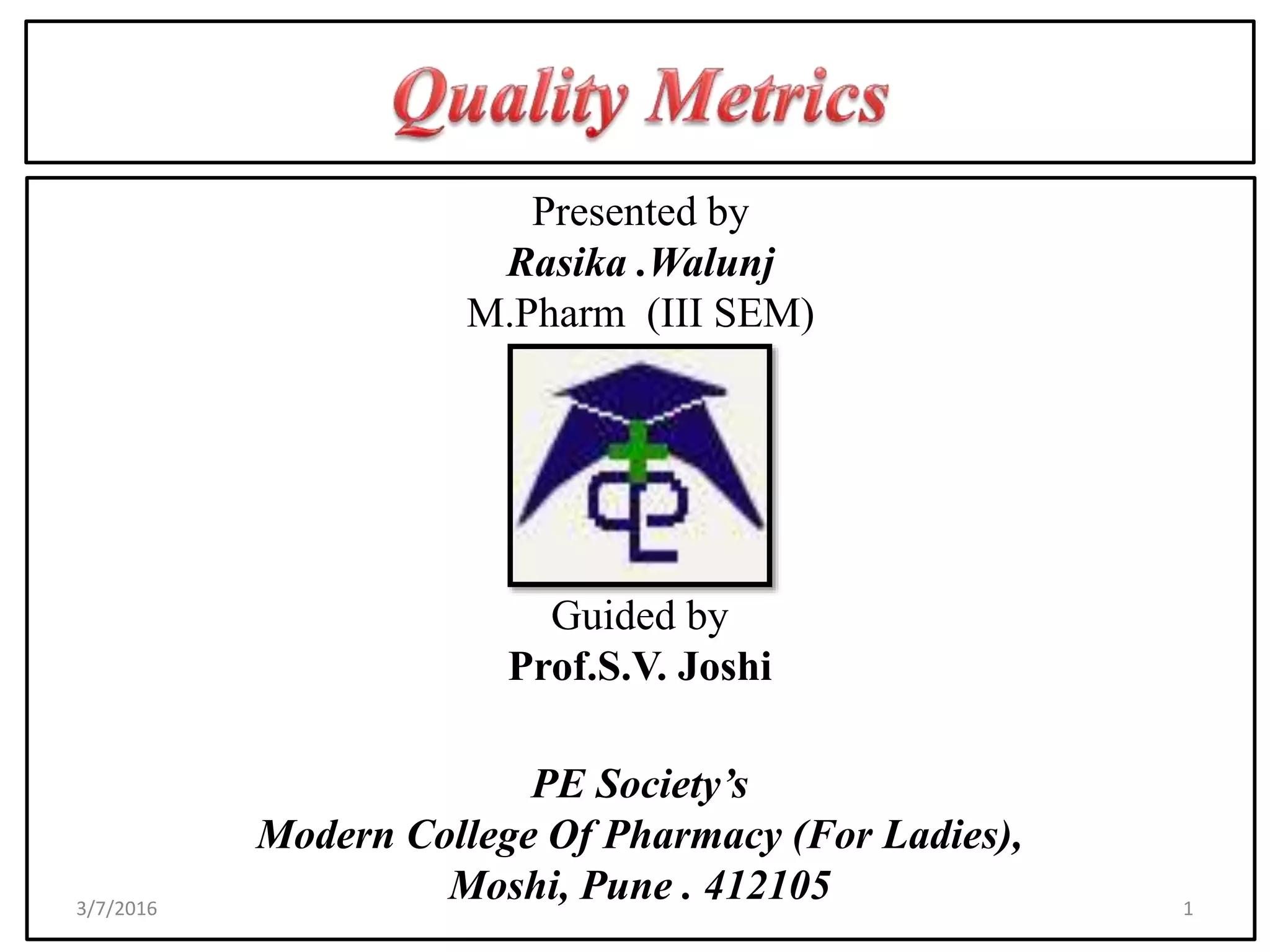 This presentation discusses quality metrics and how the pharmaceutical industry uses metrics. It defines quality metrics as elements that evaluate processes like customer satisfaction and defects. Metrics can help improve quality and productivity. The FDA requires metrics to evaluate manufacturing quality and reduce drug shortages. Guidelines like ICH Q8-Q11 provide a framework for using metrics flexibly to focus on quality. Leading and lagging metrics are discussed.