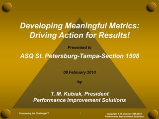 The document discusses developing meaningful metrics and provides an overview of key considerations for measurement including definitions, reasons for measuring, barriers, pitfalls to avoid, characteristics of good measures, and examples. It addresses how to determine what to measure, where to measure, and how to develop measures that are actionable and drive improvement. The presentation provides guidance on establishing an effective integrated system of metrics across all levels of an organization.