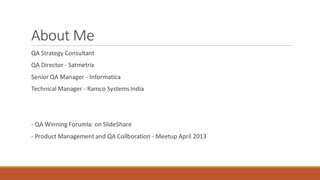 The document discusses common myths in quality assurance and provides guidance on effectively debunking myths. It defines a myth and explains why discussing myths is important for the profession. The most critical myths include definitions of quality and beliefs that automated testing eliminates manual testing or that testing requires coding skills. To debunk myths, one should present key facts without overkill, warn about false information, provide alternative explanations, and use graphics when possible. Quality assurance practices must be tailored to each specific project based on its technology, complexity, people, costs rather than following rigid processes. Factors like the type of software, industry, cost of bad quality, and a project's maturity level will impact quality approaches. Visual tools like matrices, quadrants and mind