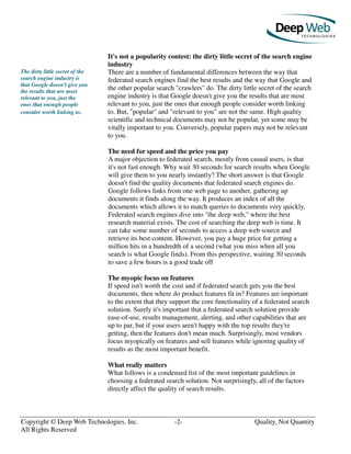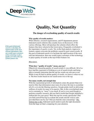 The document discusses the importance of quality over quantity in federated search results. It argues that while features are important, quality of search results should be the top priority for customers of federated search technology. The document outlines several factors that directly impact the quality of search results, such as choosing high quality sources, ensuring connectors are carefully crafted to retrieve relevant documents, and using ranking methods that surface the most relevant results. Federated search is described as the right solution for research organizations seeking to streamline knowledge discovery.