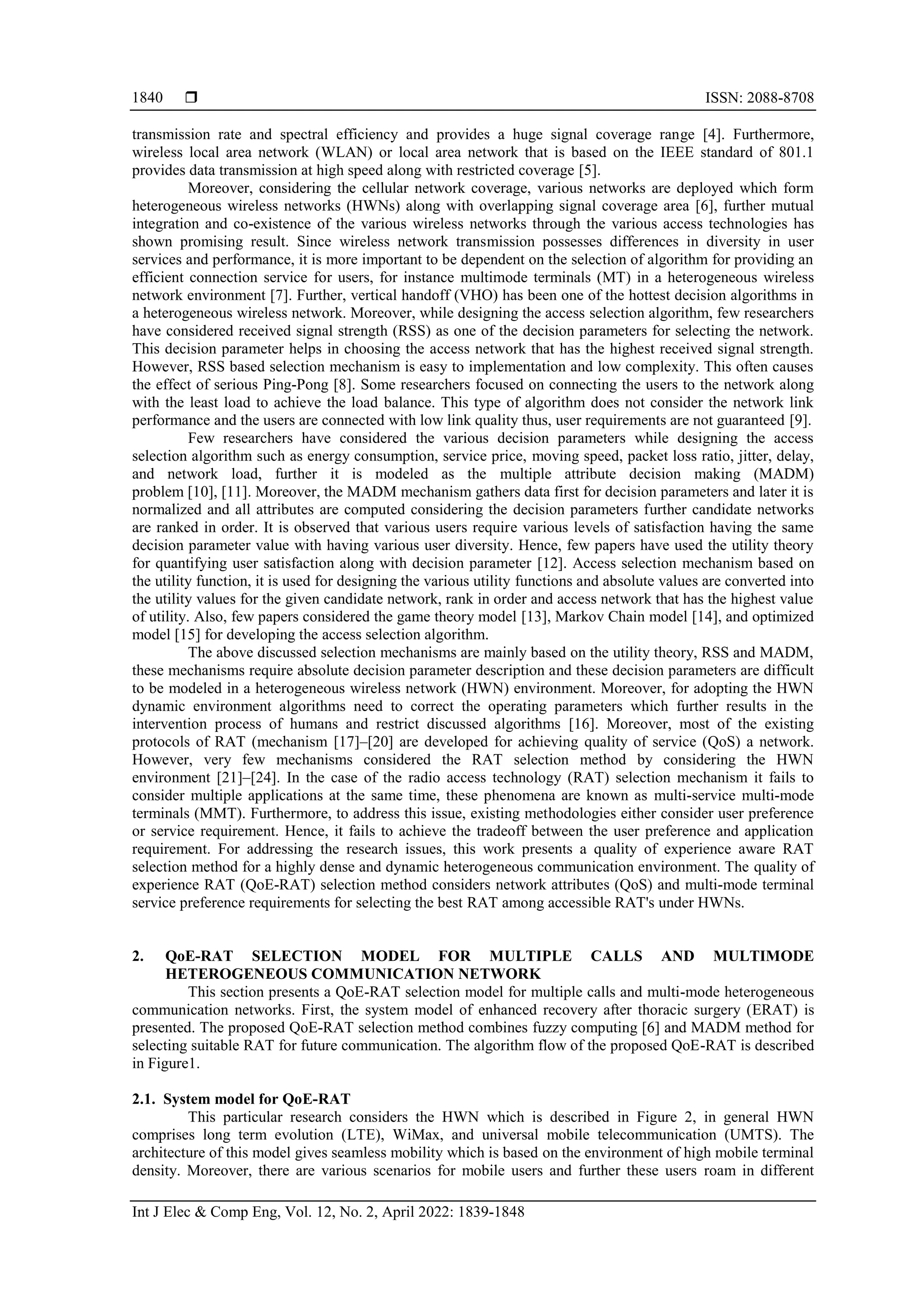 The document presents a quality of experience (QoE) aware radio access technology (RAT) selection model for heterogeneous wireless networks that considers both network performance criteria and user preferences for multiple calls and multi-mode terminals. The proposed QoE-RAT selection method uses fuzzy computing and multiple attribute decision making to select the best RAT. It first evaluates fuzzy preference-aware weights for network attributes based on user application priorities and selectivity levels. It then performs RAT ranking using a multi-mode terminal preference aware technique called TOPSIS. The model aims to achieve a tradeoff between user preference and application requirements for RAT selection in dynamic heterogeneous communication environments.