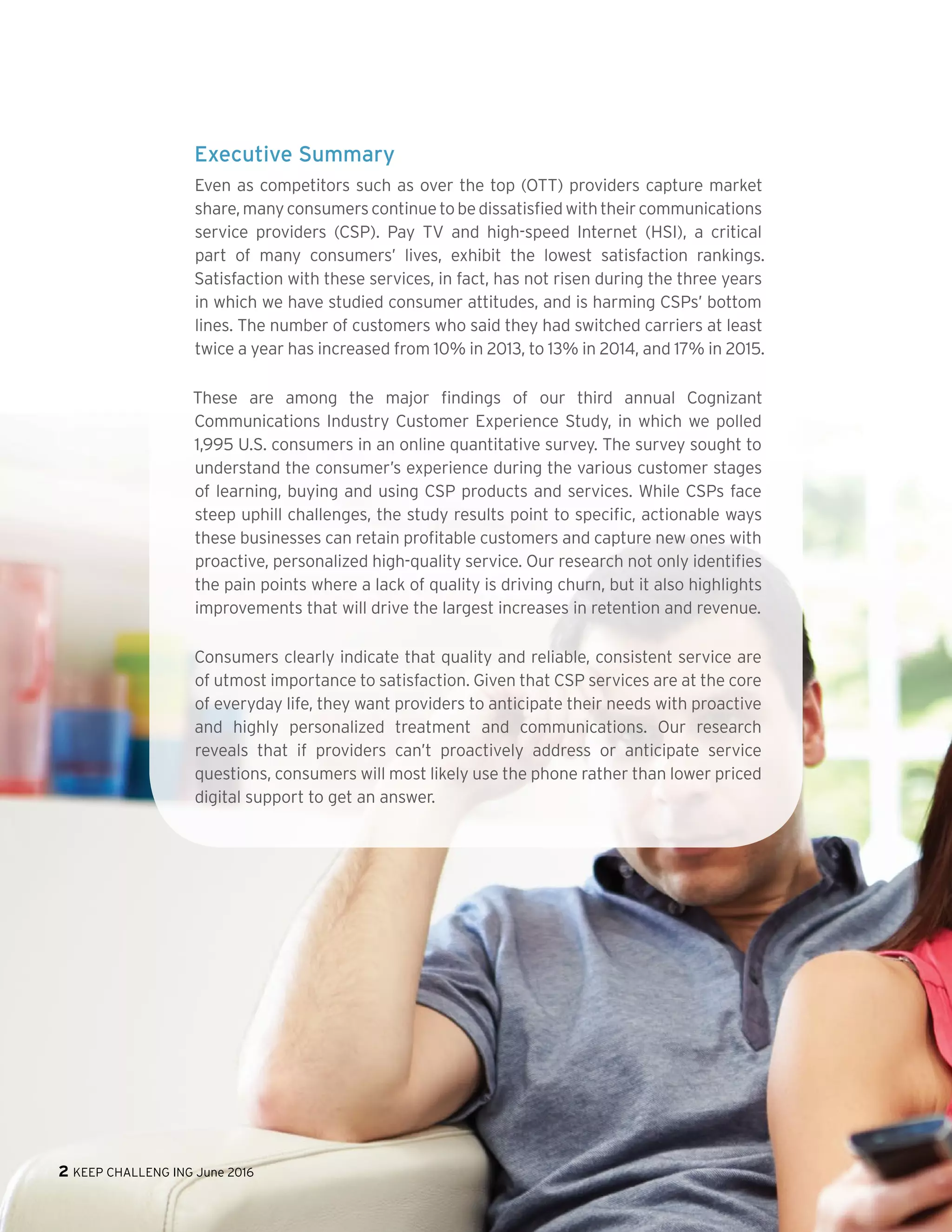 The document presents the findings of a consumer experience study focused on communications service providers (CSPs), highlighting that many customers are dissatisfied with their service, particularly in pay TV and high-speed internet. It emphasizes the need for CSPs to improve service quality, enhance digital channels, and innovate connected technologies to retain customers and reduce churn, especially among Millennials who are seeking more personalized and proactive experiences. Key recommendations involve leveraging data analytics to anticipate customer needs and addressing the gap in customer satisfaction with current service offerings.