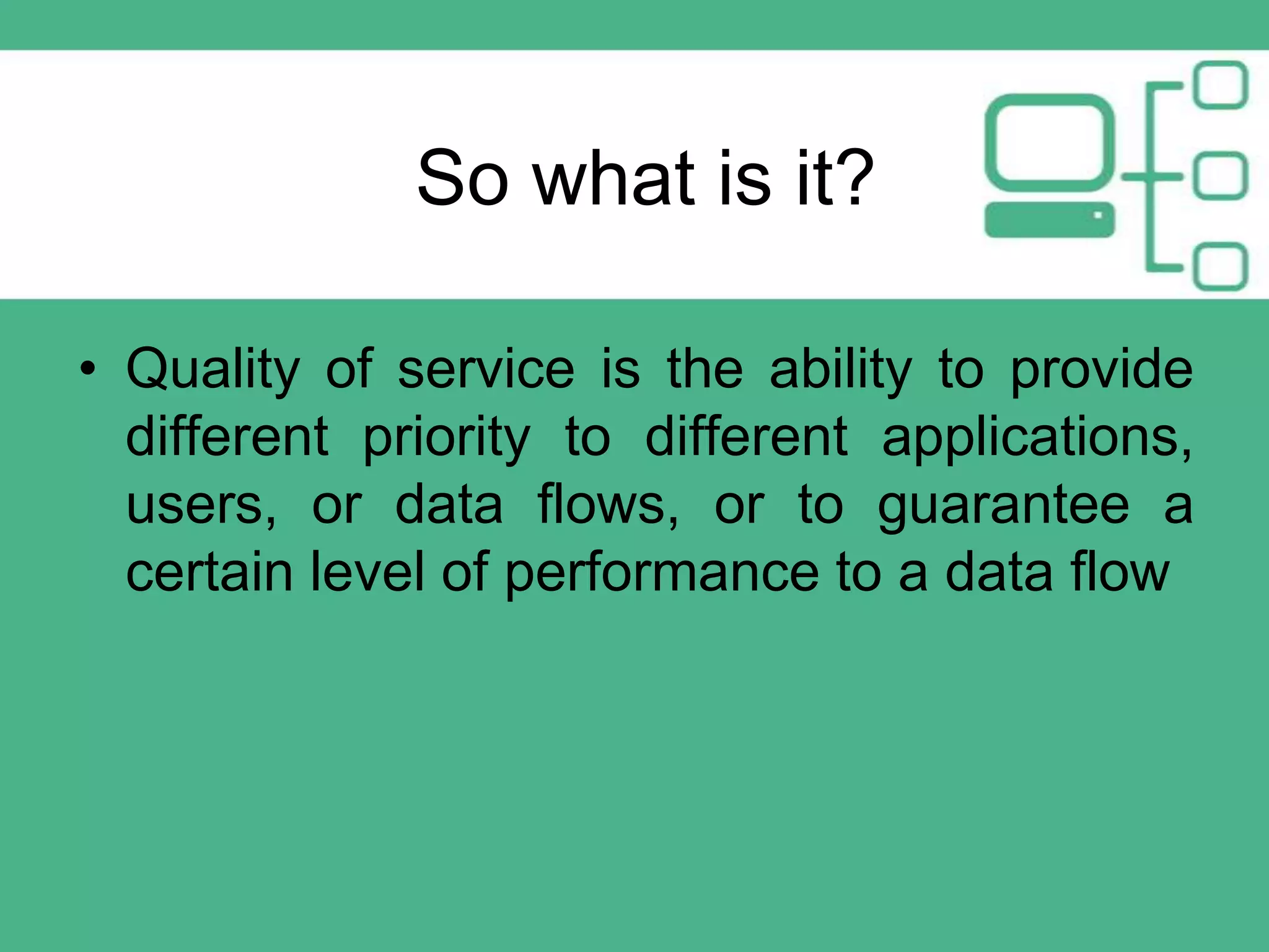 Quality of service aims to provide different levels of priority to different applications, users, or data flows. It is achieved through techniques like scheduling, traffic shaping, resource reservation, and admission control. Scheduling methods include FIFO queuing, priority queuing, and weighted fair queuing. Traffic shaping uses leaky bucket and token bucket algorithms. Resource reservation reserves buffer space, bandwidth, and other resources beforehand. Admission control restricts packet admission based on specifications. Models for QoS include the Integrated Services Model, which requires resource reservation in advance using RSVP, and the Differentiated Services Model, which differentiates traffic into classes.