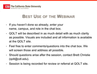 The webinar focuses on the Quality Online Learning and Teaching (QOLT) initiative designed to improve hybrid and online courses through detailed evaluation tools and faculty development. Key topics include the QOLT evaluation instrument, which assesses various aspects of course delivery and instructional quality, as well as the importance of student feedback in enhancing course effectiveness. The session provides resources and guidelines for faculty to develop quality online learning experiences and recognizes exemplary practices within the CSU system.