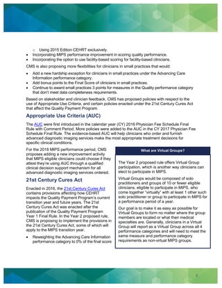 The proposed rule for Year 2 of the Quality Payment Program under MACRA aims to improve health outcomes while minimizing clinician burdens. It introduces changes to the Merit-Based Incentive Payment System and Advanced Alternative Payment Models, such as increasing low-volume thresholds and introducing virtual groups for participation. Stakeholder feedback led to the inclusion of new policies and flexibilities focusing on enhancing care coordination and encouraging the use of advanced diagnostic imaging services.