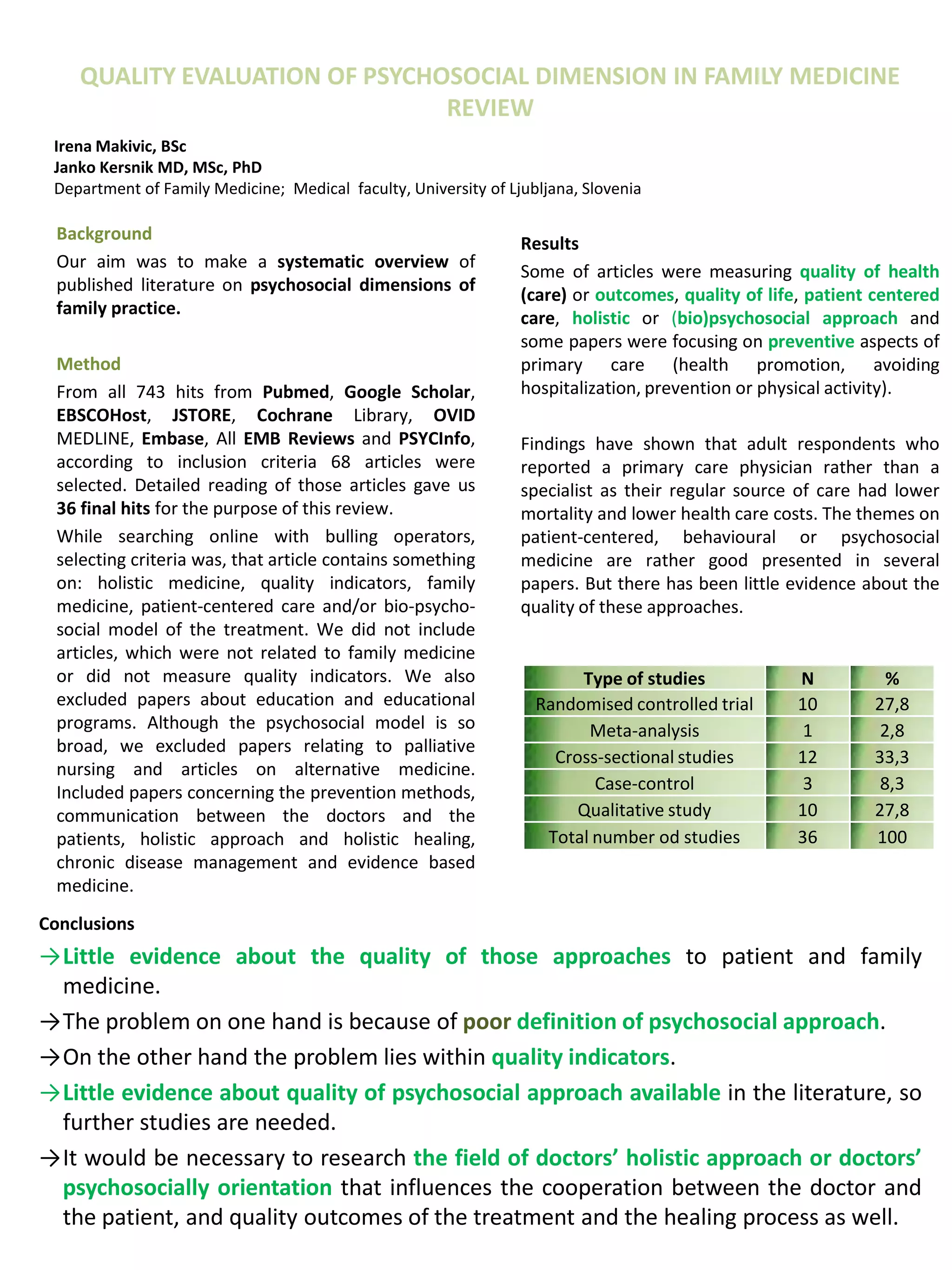 3) The review found little evidence about the quality of psychosocial approaches in family medicine, due both to poor definitions and a lack of appropriate quality indicators. Further research is needed.
