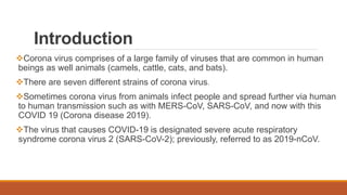 This document provides information on COVID-19, including that it is caused by a coronavirus that commonly infects humans and animals. The virus spreads mainly through respiratory droplets from coughing or sneezing. Most cases are mild, but some develop severe pneumonia requiring hospitalization. Diagnosis is via PCR testing of respiratory samples. While there is no vaccine, potential treatments include chloroquine and supportive care. Public health measures aim to test, isolate cases and trace contacts to control spread.