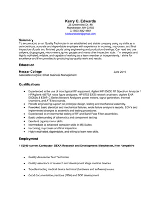 This document is a resume for Kerry C. Edwards seeking a position as a Quality Technician. It summarizes their experience and qualifications, including over 25 years of experience in quality assurance, inspection, and testing of RF components and medical devices using various measurement tools. They have an Associate's Degree in Small Business Management and have held several roles with increasing responsibility in quality assurance and engineering technician roles.