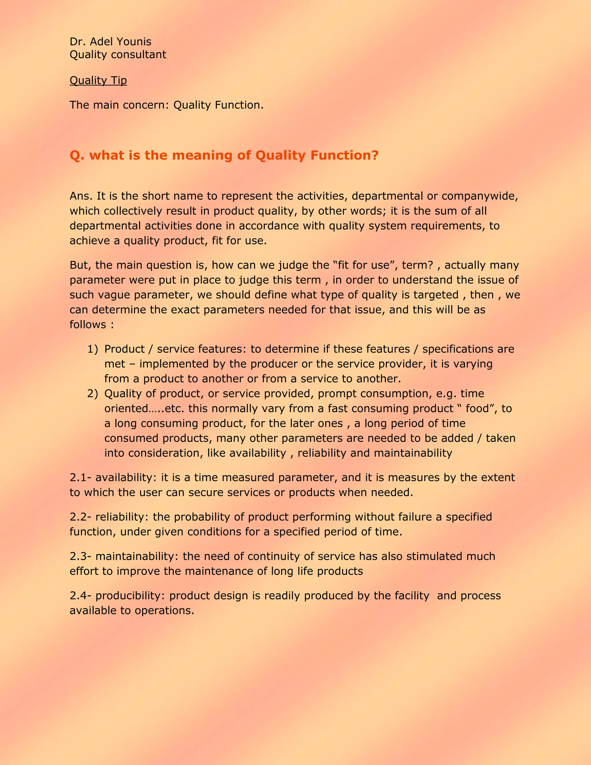 Quality function refers to all activities within a company or department that collectively work to achieve a quality product fit for use. Whether a product is fit for use can be judged based on various parameters that depend on the type of quality being targeted. These parameters may include meeting product specifications, quality and promptness of consumption for fast-consuming products, and availability, reliability, maintainability, and producibility for long-consuming products.