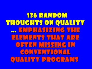 Tom Peters delivered a speech in New Delhi sponsored by the American Society for Quality where he provided 136 random thoughts on quality. The thoughts emphasized elements often missing from conventional quality programs. The thoughts ranged from ensuring quality reception desks and greetings to strategic listening, kindness, clean restrooms, green buildings, and simple systems. Quality was defined broadly throughout the random thoughts.