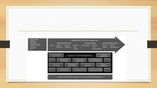 Quality refers to doing things right the first time according to established requirements and standards. It involves accuracy, reliability, and timeliness of laboratory test results. Quality control monitors performance against standards, quality assurance refers to all operational aspects, and quality management involves determining policy objectives and implementing quality planning, control, and improvement. Laboratory accreditation in India is administered by the National Accreditation Board for Testing and Calibration Laboratories (NABL) based on the ISO 15189 standard, which specifies requirements for quality and competence in medical laboratories. The quality management system involves establishing essential elements like organization, customer focus, facilities management, and processes to assure quality.