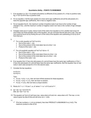 1. The document provides 51 quantitative ability points to remember related to equations, roots, probability, time/work problems, calendars, and properties of numbers, polynomials, and shapes.