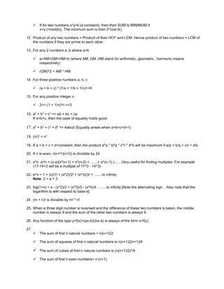 3. The document also outlines formulas for sums of natural numbers, squares, and cubes, as well as properties of rational numbers, logarithms, factorials, and perfect squares.