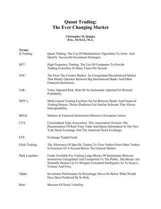 This document discusses how quant trading and dark pools have come to dominate the markets in Europe and beyond. It outlines how regulatory changes like MiFID led to growth in multi-lateral trading facilities and off-exchange trading between major banks and institutions. Now, over-the-counter markets with little transparency have much larger trading volumes than public exchanges. Traditional investors and day traders have little chance of success against high-frequency quant strategies that access non-public order flows and data. The landscape has changed dramatically and any trader ignoring these new realities does so at their own peril.