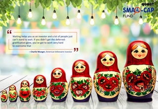 The document discusses the investment potential of small-cap companies, emphasizing their high growth prospects and the opportunities for capital appreciation over the long term. It highlights the characteristics that make small caps attractive, such as lower market analyst coverage leading to undervaluation, diversification across sectors, and the potential for significant returns for patient investors. Additionally, it outlines the investment strategy of a specific small-cap fund, focusing on companies with solid fundamentals and visionary management while employing rigorous risk management techniques.