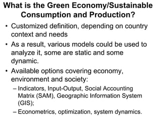1) Green economy models can help analyze proposed policies and investments across economic, social, and environmental sectors to assess their system-wide impacts.