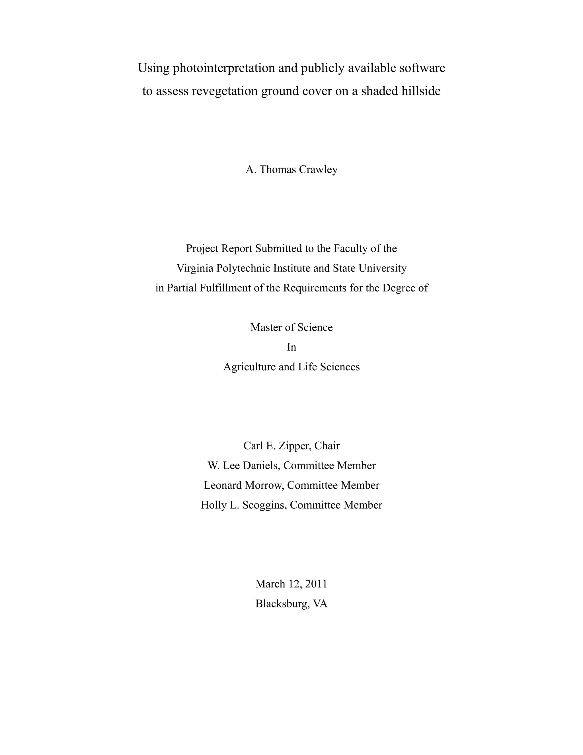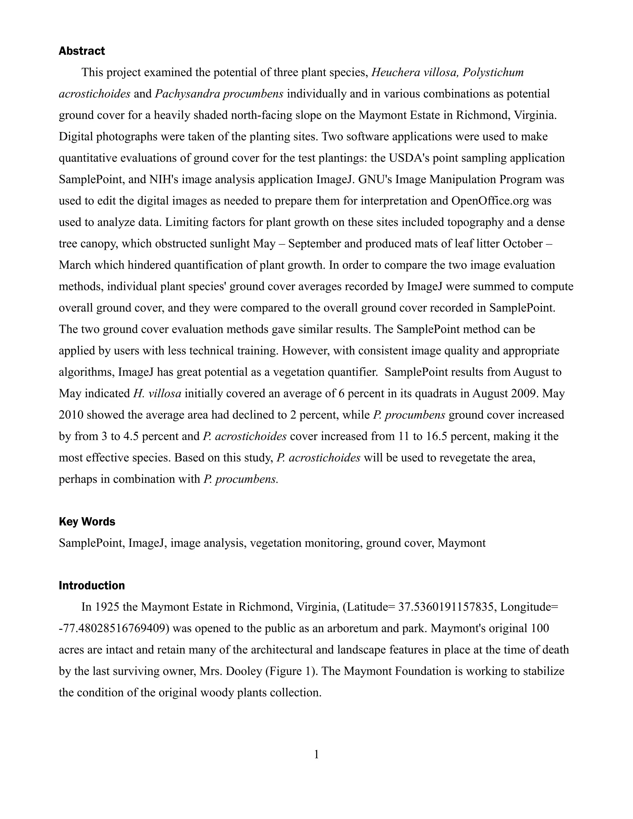 This project evaluated the potential of three plant species - Heuchera villosa, Polystichum acrostichoides, and Pachysandra procumbens - for ground cover on a shaded north-facing slope at the Maymont Estate in Richmond, Virginia. Digital photos of test plots with different species combinations were taken over time. Two software programs - SamplePoint and ImageJ - were used to quantify ground cover from the images. SamplePoint uses point sampling while ImageJ analyzes pixel colors. Results from the two methods were similar. SamplePoint is easier to use but ImageJ has potential with proper algorithms. P. acrostichoides showed the best growth over time, increasing from 11% to