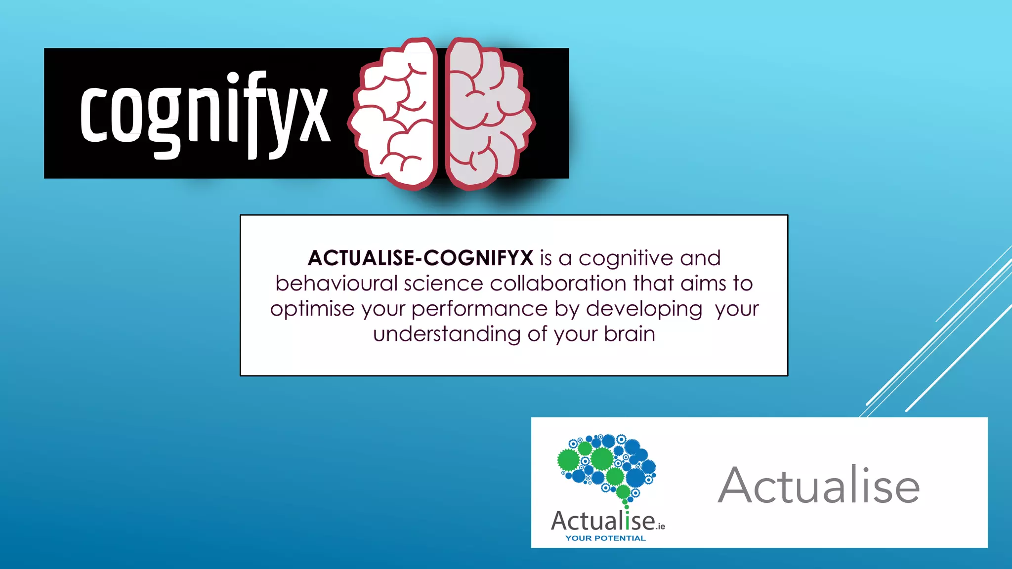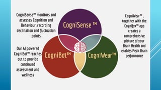 This document discusses neurofeedback training (NFT) provided by Actualise-Cognifyx, which aims to optimize performance by developing understanding of the brain. NFT works by measuring and mapping brain function in real-time, then improving undesirable brain activity through positive reinforcement on an on-screen display to change psychological functioning and brain health. Case studies show changes in brain activity for an 8-year-old boy with autism, ADHD and ODD across NFT sessions. The document also summarizes global and Irish mental health trends and Cognifyx's capabilities in understanding cognition, emotion and behavior using technology, psychology experts and AI to detect, prevent and develop cognitive skills.