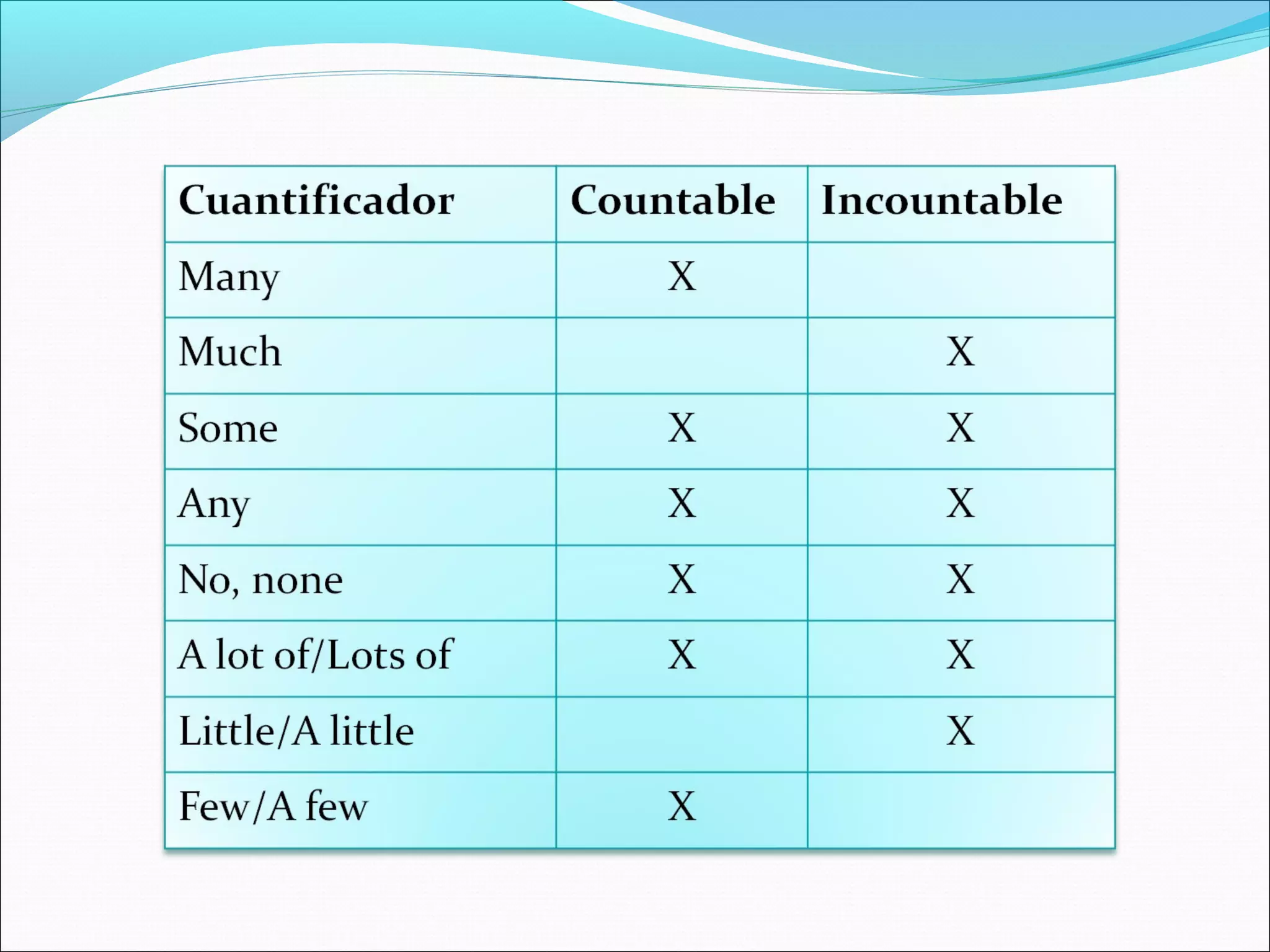 This document discusses different quantifiers used in English including many, much, some, any, none, lots of, little, and a few. It explains that quantifiers indicate amounts and are used with countable and uncountable nouns. Some key points covered include how many, much, some, and any can be used in affirmative, negative, and interrogative sentences, while none, lots of, little, and a few have more restrictive uses depending on whether the noun is countable or uncountable. Examples are provided to illustrate the different quantifiers.
