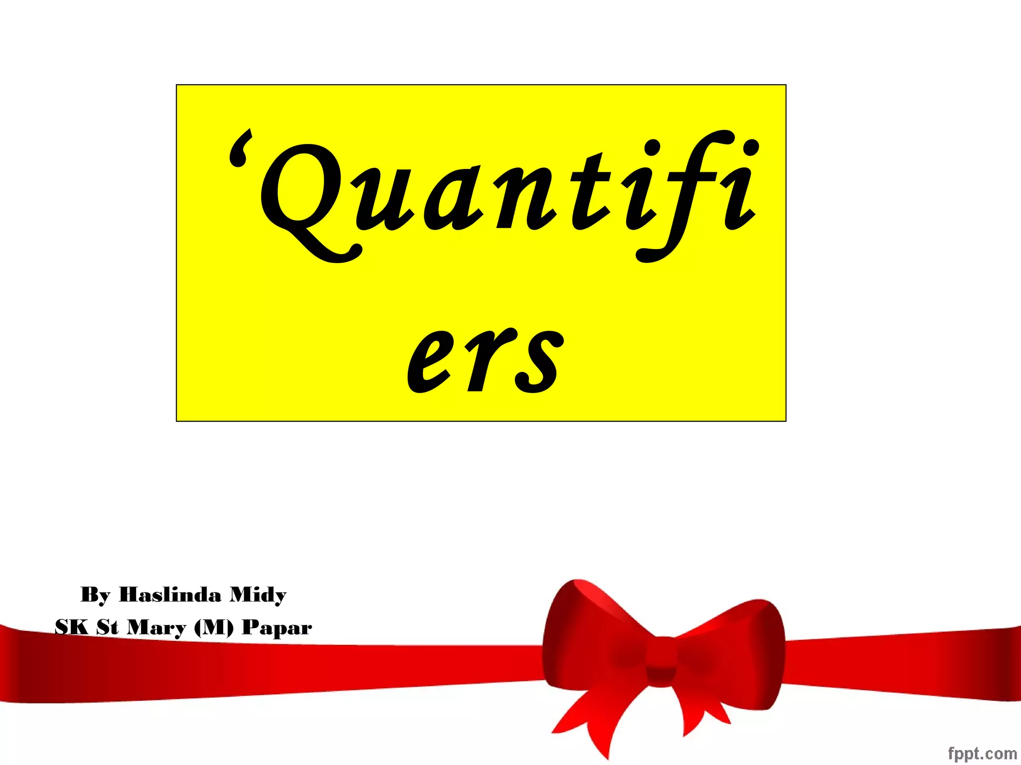 This document discusses quantifiers such as some and any. It provides examples of how some is used in positive sentences with both countable and uncountable nouns, while any is used in interrogative and negative sentences. There are also examples of rules for using some and any in questions when offering or requesting something. Additional quantifiers like something, anything, somewhere, and someone are introduced. Tables and exercises with examples of filling in blanks with some or any are included to illustrate the rules.
