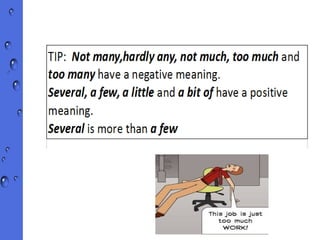 This document defines and provides examples of quantifiers. It explains that a quantifier is a word or phrase used before a noun to indicate an amount or quantity. It then lists and categorizes different types of quantifiers that can indicate small, large, or correct quantities for countable nouns, uncountable nouns, or both. It also provides additional examples of quantifiers used with specific uncountable nouns.