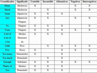 This document discusses various English quantifiers - many, much, some, any, a few, few, and a little. It provides examples of how each quantifier can be used in positive, negative, and interrogative sentences. Many and much are used to indicate quantity and are differentiated based on countable vs. uncountable nouns. Some, any, a few/few indicate undefined or unknown quantities. A little is used for uncountable nouns or objects that cannot be counted.