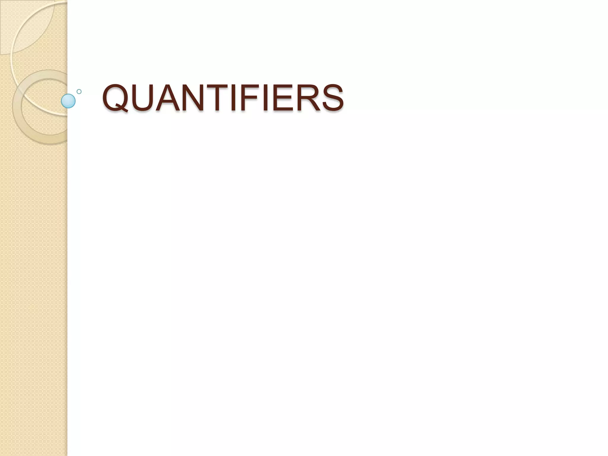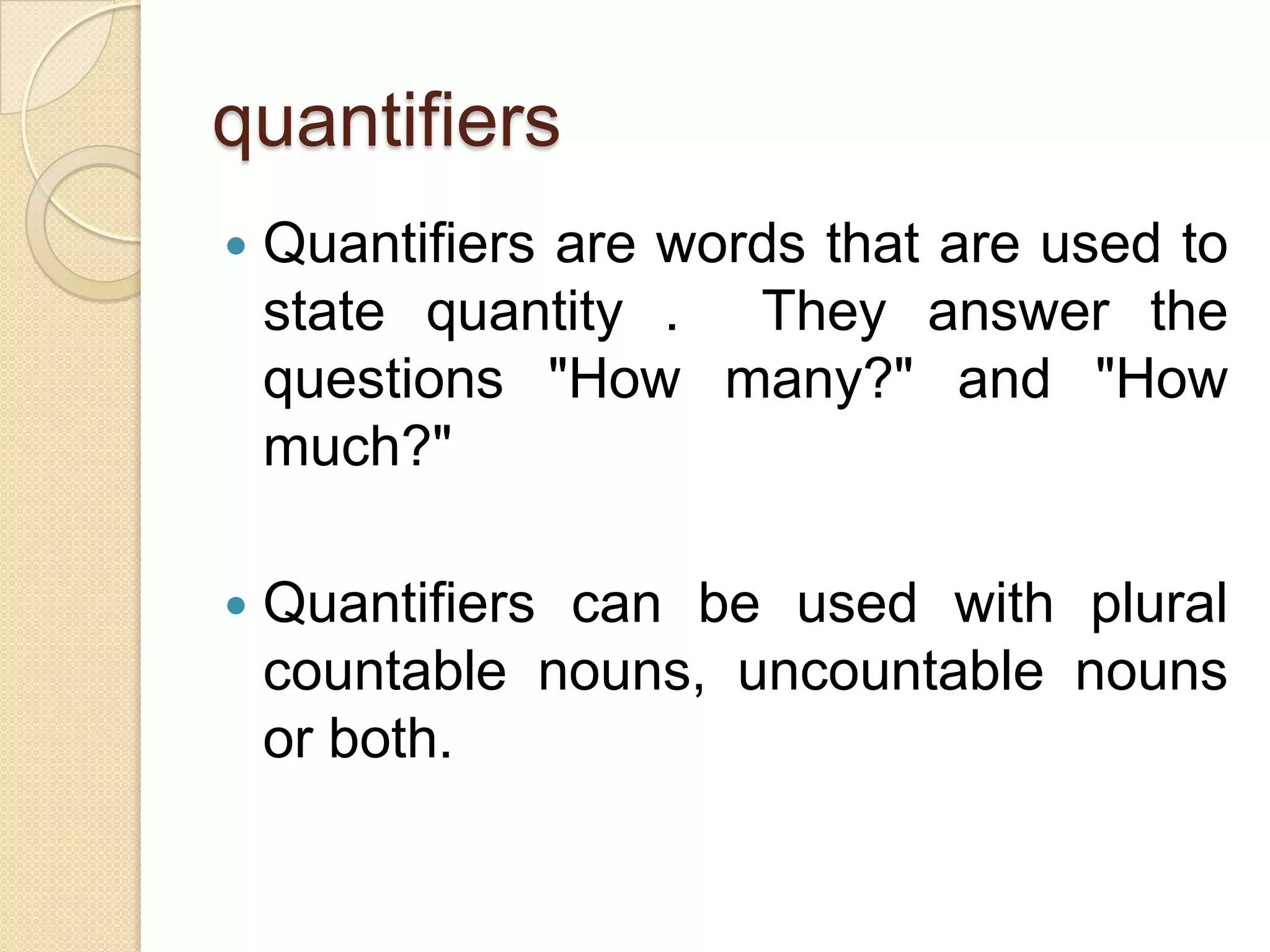 This document discusses different types of quantifiers used to indicate quantity in English. It explains that quantifiers can be used with countable nouns, uncountable nouns, or both, and answers questions like "how many" and "how much." The main quantifiers discussed are a lot of, lots of, much, many, a little, a few, too, enough, some, any, no, nobody/none, and anything/nowhere. Examples are provided to illustrate the proper usage of each quantifier in different contexts.