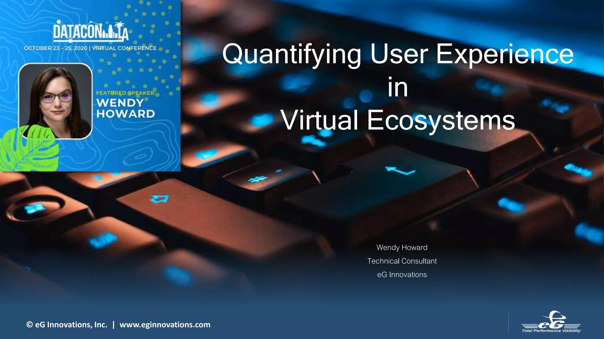 The document discusses the challenges of managing user experience in virtual environments, highlighting the complexity of identifying performance issues stemming from various factors such as latency, bandwidth, and response times. It outlines key metrics for measuring user experience, including logon times and connection quality, while providing guidelines for effective monitoring practices. Additionally, it presents solutions offered by eg innovations for monitoring user experience across platforms like VMware Horizon and Citrix.