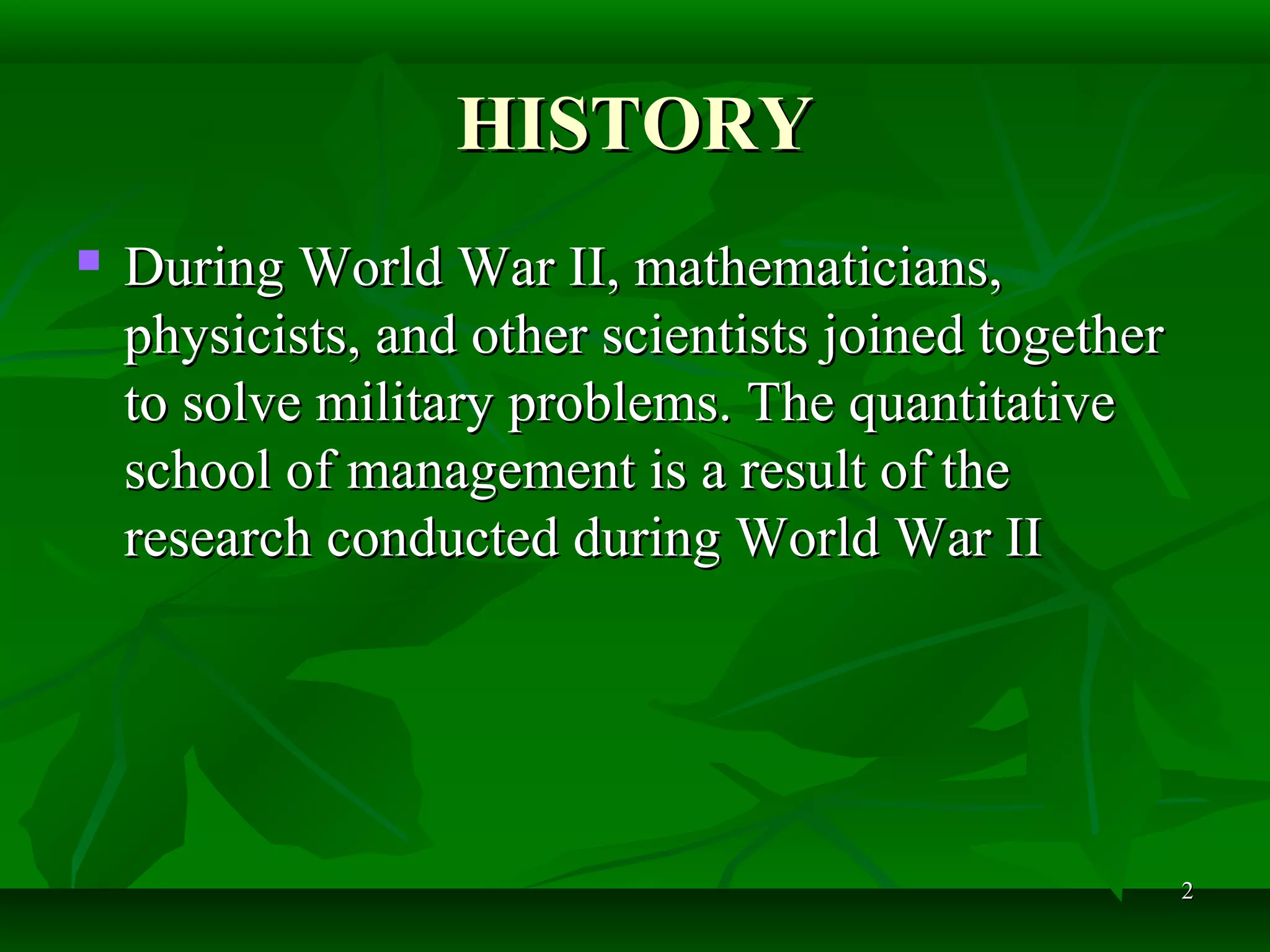The quantitative approach to management involves using quantitative techniques like statistics, optimization models, and computer simulations to improve decision making. It emerged from research during World War II and includes fields like management science, operations management, and management information systems. Management science applies techniques like forecasting and inventory modeling to management decisions, while operations management focuses on transforming inputs into outputs. Management information systems designs computer systems to provide information to managers. Today, quantitative techniques aid planning, budgeting, scheduling and quality control, though managers must interpret results.