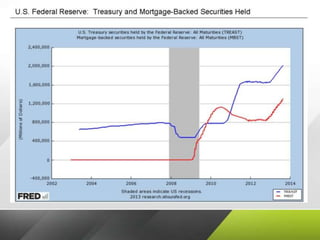 Quantitative easing (QE) is an unconventional monetary policy used by central banks to stimulate the economy by increasing the money supply. It involves flooding financial institutions with capital to promote increased lending and liquidity. The funds are created electronically rather than physically printed. Several central banks, including the Bank of Japan, US Federal Reserve, Bank of England, and European Central Bank engaged in QE programs following the 2008 financial crisis to boost their economies by lowering interest rates and purchasing assets like government bonds. While QE can help stimulate demand, there are also risks like potential impact on savings, pensions, inequality and emerging market economies.