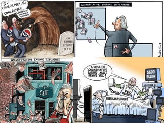 Quantitative easing (QE) is an unconventional monetary policy used by central banks to stimulate the economy through increasing the money supply when standard policies are ineffective. It works by having the central bank buy financial assets like treasury bonds from banks, increasing their prices and lowering interest rates. This aims to encourage borrowing and spending by businesses and households. The document outlines the history of QE programs in the US since 2008 and discusses whether they achieved their goals as well as the potential benefits like economic growth and risks like higher inflation.