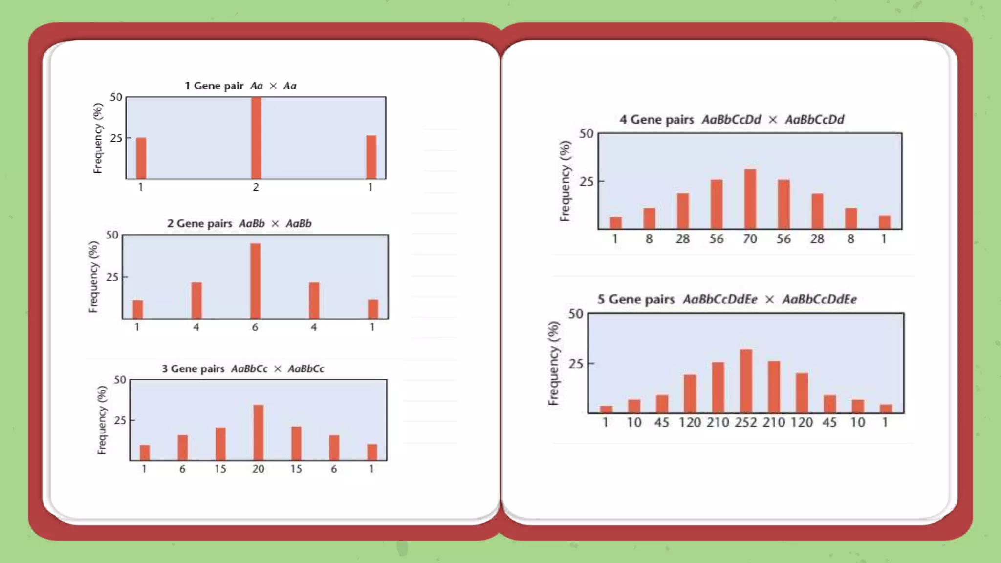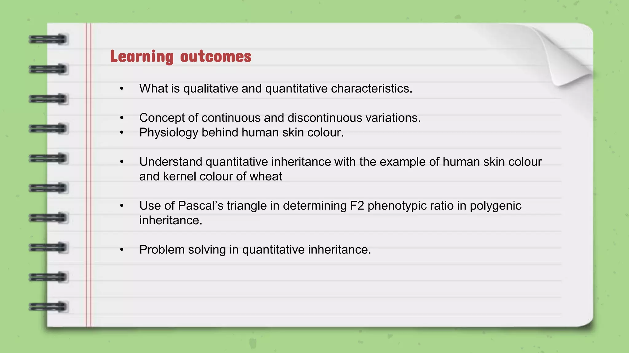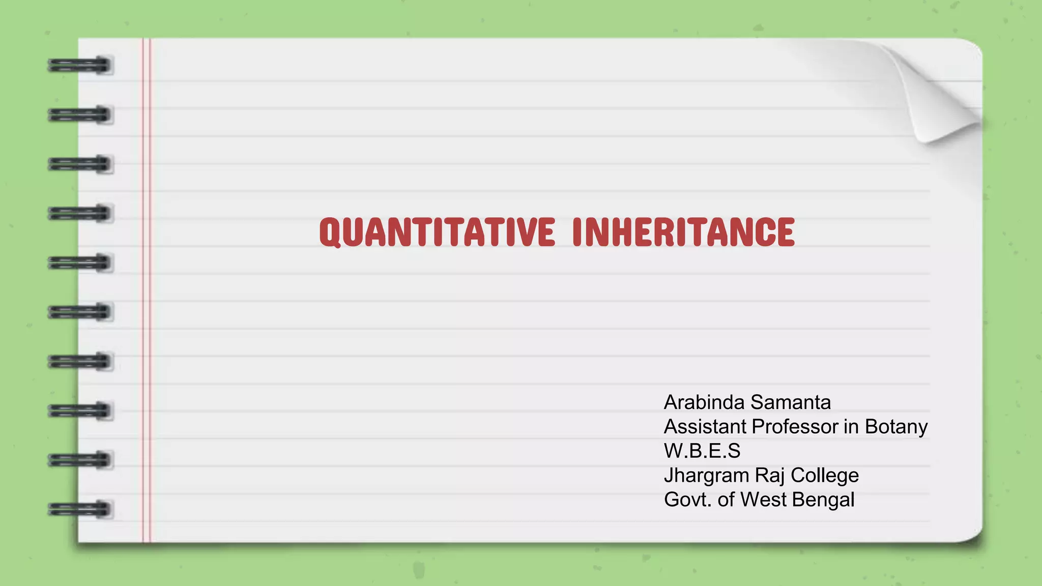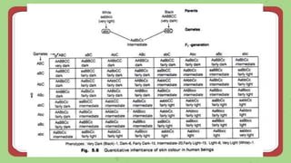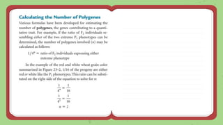 This document discusses quantitative inheritance, which refers to inheritance of traits that are influenced by multiple genes and the environment. Quantitative traits show continuous variation and are influenced by small effects from many genes. Examples discussed include human height, skin color, and kernel color in wheat. The kernel color experiment of Nilsson-Ehle is used to demonstrate quantitative inheritance. It involved crossing two wheat varieties and analyzing the ratios of kernel color phenotypes in the offspring. For the experiment to work well, the genes influencing color needed to have additive effects and the environment could not impact phenotypes. The experiment helped establish that quantitative traits are influenced by multiple independent gene loci.