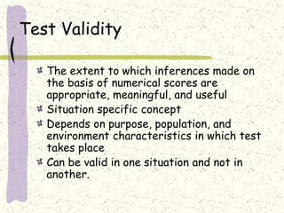 1. Test validity refers to how appropriate and meaningful test scores are and depends on the testing situation and purpose. Validity can be evaluated through test content, structure, and relationships to other criteria.