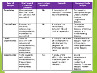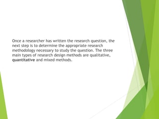 The document outlines various research methodologies, emphasizing the distinctions among qualitative, quantitative, and mixed methods. It discusses the research process, types of research designs, and the importance of formulating a clear research problem. Additionally, it details different types of quantitative and qualitative research approaches, their characteristics, and the structure of thesis and dissertation work.