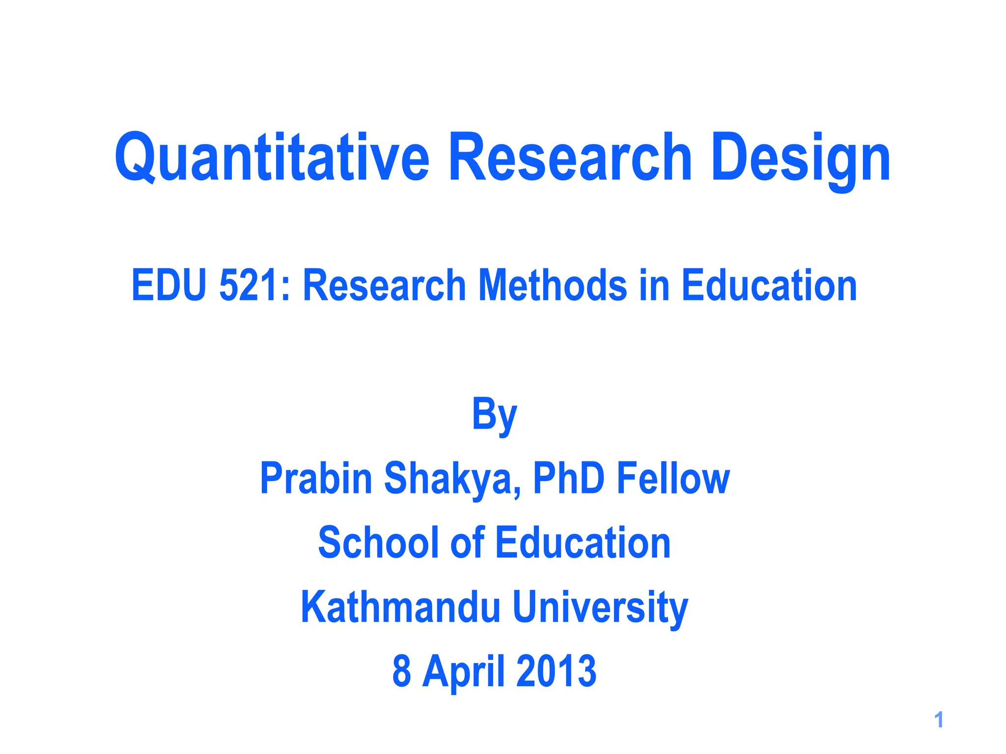 This document discusses quantitative research design. It defines research design as the conceptual structure and plan for conducting research, including assumptions, strategies, data collection and analysis. Quantitative research is objective and systematic, utilizing numerical data to study social problems. It tests hypotheses deductively and looks for cause-and-effect relationships between variables. Quantitative research is rooted in postpositivism and employs experimental or survey strategies to quantify trends, attitudes or relationships, allowing results to generalize to populations. Methods involve predetermined questions, performance/attitude measurement, and statistical analysis and interpretation to test theories.