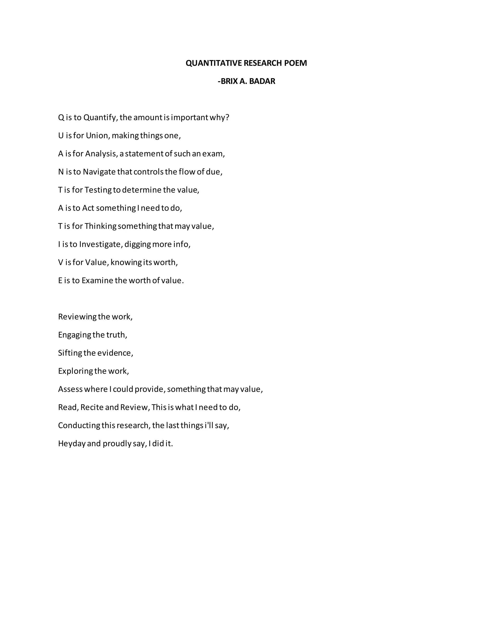 This poem outlines the key aspects of quantitative research through each letter in the word "QUANTITATIVE". It describes quantitative research as quantifying amounts, analyzing through examination and testing, navigating the flow of data, thinking about and investigating ideas to determine their value. The poem emphasizes reviewing evidence, exploring work, and assessing contributions throughout the research process before proudly concluding the work.
